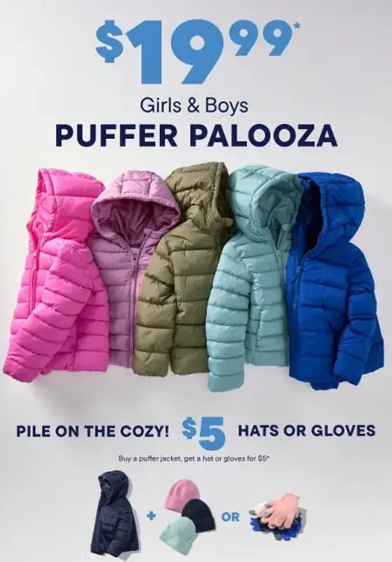 Valid for a limited time on in-stock merchandise only. Discount only applies to select styles of puffer jackets, hats, gloves and mittens marked as eligible only. Excludes clearance or third-party, co-branded & licensed merchandise. Valid in U.S. and Puerto Rico stores. Valid on The Children’s Place, Sugar & Jade and PJ Place branded merchandise only; excludes Gymboree branded merchandise. Buy one (1) $19.99 puffer jacket, get hat(s) or pair(s) of gloves or mittens for $5 each. Prices do not include applicable taxes or shipping costs. All eligible items must be in the same transaction to qualify for the offer. Not valid toward purchase of gift cards, previously purchased merchandise, credit card payments, clearance or third-party, co-branded & licensed merchandise. Cannot be combined with other offers except My Place Rewards Certificates and My Place Rewards points redemption discount (“MPR Discount”) (up to a maximum MPR Discount of $50 per day). Participation in offer is acceptance of its terms. Offer may be cancelled or modified by The Children’s Place, Inc. at any time. Void where prohibited.