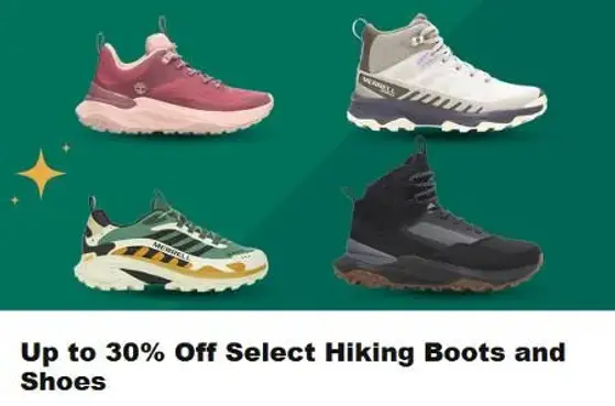 Get it now! Shop in store and get up to 30% off select hiking boots and shoes.