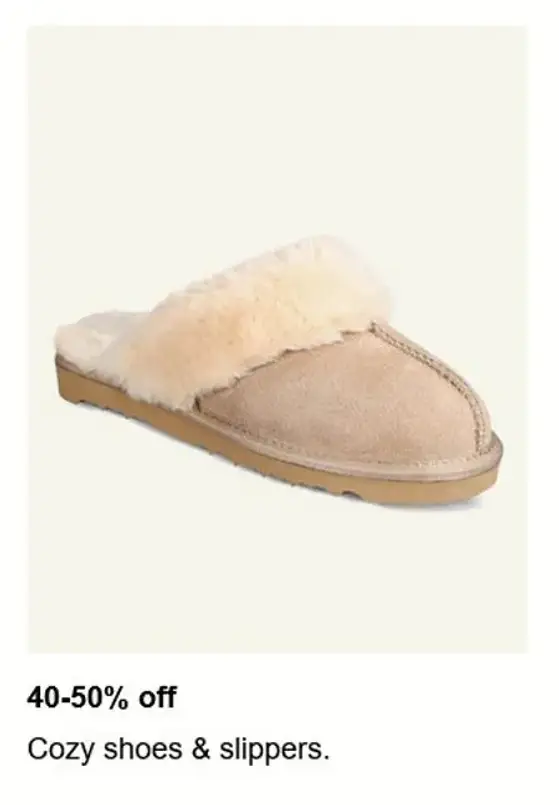 Act fast! Shop in store and get 40-50% off cozy shoes and slippers.